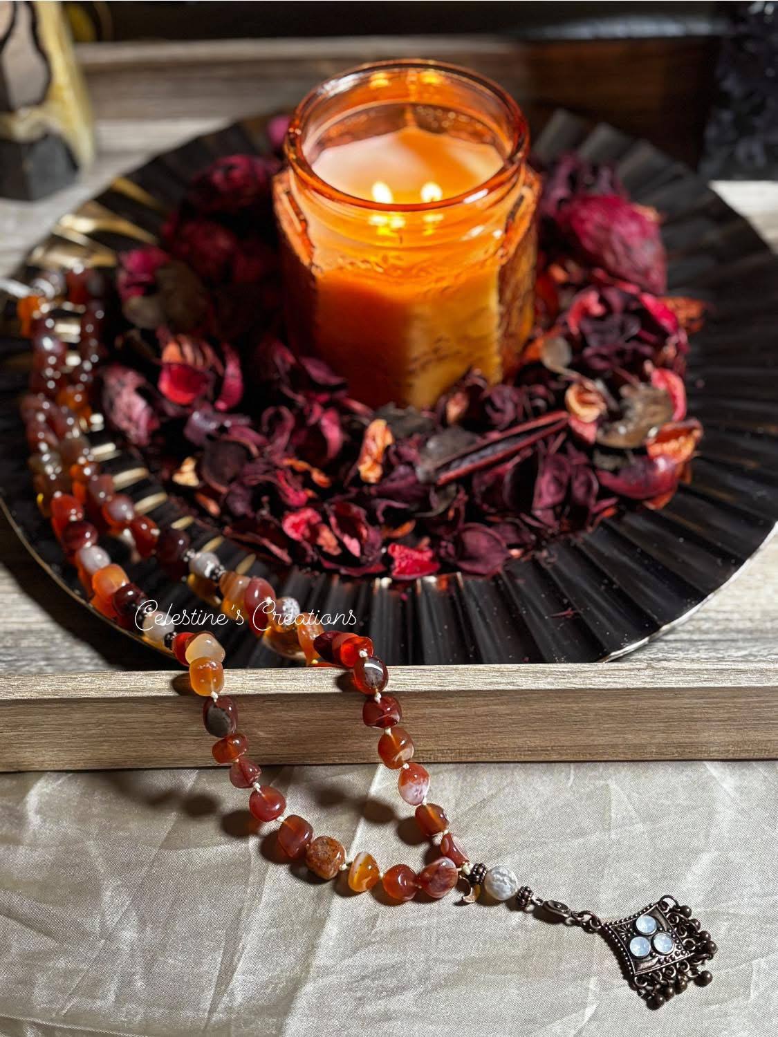 Created for the goddess who smokes with intention and walks in her knowing, it features fiery Carnelian and luminous White Agate beads, each hand-selected and knotted with love, clarity, and courage in mind.