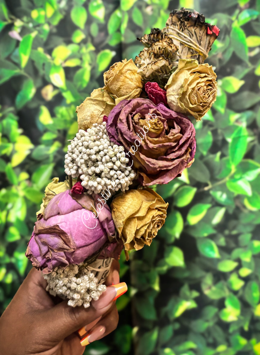 Handcrafted by Celestine's Creations with ritual, rhythm, and reverence, this floral smoke wand was the same bundle we used to cleanse the space during our “Goddess Come Home” ritual. From the very first flame, it set the tone for sacred transformation, soft strength, and spiritual return.